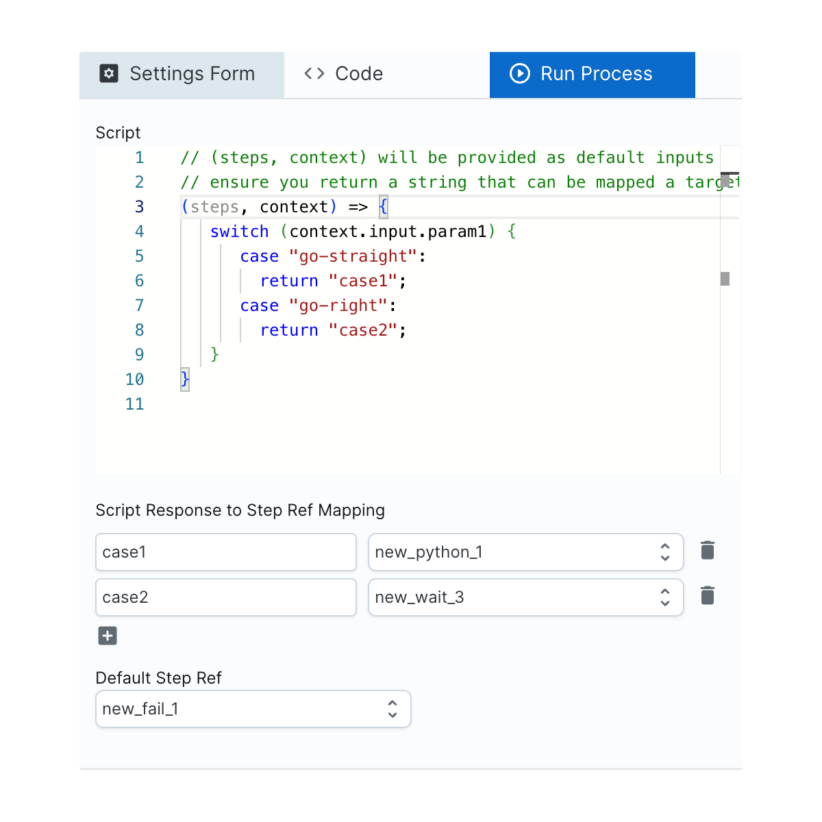 The expected JavaScript snippet syntax is identical to the one in the JavaScript Step, except the returned object is expected to be a String, used to indicate which path to take.
