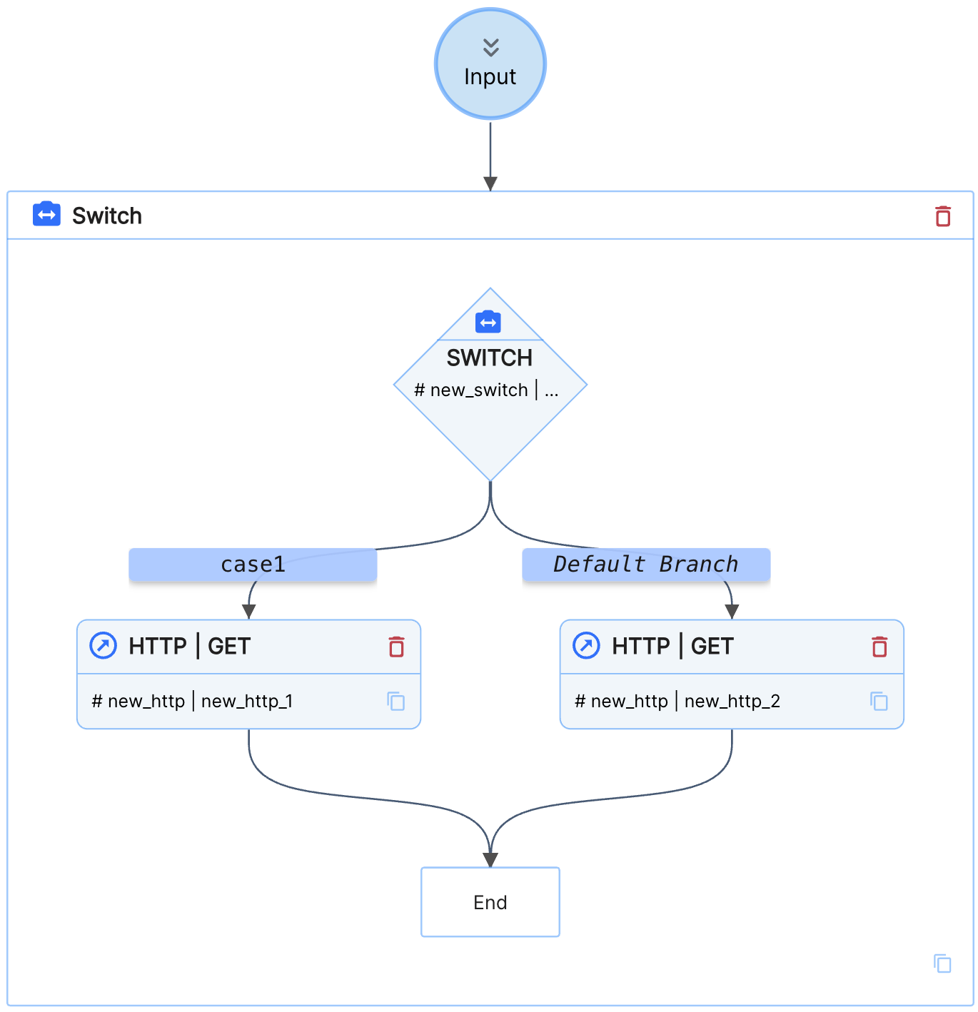 The possible switch cases are just children of the switch step. And you map the case to the child's ref!
